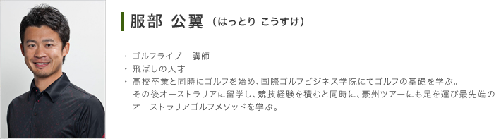 300yを超えるショットと、飛ばしのレッスンで話題を呼ぶ。高校卒業と同時に、ゴルフの専門学校国際ゴルフビジネス学院に入学、ゴルフの基礎を徹底的に学ぶ。その後、さらなる成長のために豪州留学。現地で競技経験を積むと同時に、ツアーにも足を運んでオーストラリアゴルフメソッドを学ぶ。帰国後、独自の飛距離アップ法を作り上げ、ティーチングを始める。その独自の飛距離アップ法が話題を呼び、ティーチングの道に専念。自身のスイング研究から培った、美しく飛距離のでるスイングが持ち味。スイングからトレーニングまで、飛距離アップのトータルケアは万全。さらに、飛距離をテーマにしたDVD「ロングドライブプログラム」を2011年に発売。その他ゴルフ雑誌に関わらず、多方面のメディアにも出演経験をもつ。レッスンでいつも生徒に伝えている想いは、、、「あと、30ヤード飛ばすと、ゴルフが100倍楽しくなる」