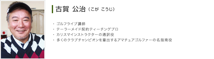 レッスンプロとして26年間に指導した生徒は延べ15万人、指導時間38,000時間以上。多くのクラブチャンピオンを輩出するなど、アマチュアゴルファーの名指南役として活躍。父は元関西プロゴルフ協会会長として、JGTO初代代表の島田幸作氏や賞金女王3回の大迫たつ子氏を指導した古賀春之輔。主に関西を拠点にレッスン活動を行なう。やり方を一方的に押し付ける指導ではなく、アマチュアの立場に立った理路整然かつ懇切丁寧な指導は、レッスンを受けるアマチュアゴルファーからは絶大な信頼と支持を得ており「カリスマインストラクターの通訳役」とも呼ばれる。2014年6月より、メールマガジン読者15万人以上を誇るゴルフライブの講師としての活動を開始。