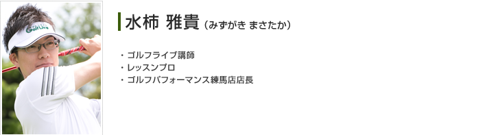 茨城県出身 身長168cm、飛距離は280y。 15歳でゴルフを始め、名門水城高校に入学。 高校卒業と共にスプリングフィルズゴルフクラブで研修生としてプロゴルファーを目指し、多くの試合経験を積む一方、研修生仲間にスイングアドバイスをしている中で、ゴルフを教えることの楽しさを知り、2012年にPGAティーチングプロの資格を取得。 2015年小原大二郎氏に師事し、ゴルフスイング・レッスン理論を学び、ゴルフパフォーマンスの一員となる。 現在はゴルフパフォーマンス練馬店にて、「真剣に、分かりやすく、丁寧に」をモットーに年間延べ1,000人以上のゴルファーにレッスンをしている。 初心者の方から競技志向の方まで、「理論的でわかりやすいレッスン」と定評があり、小柄な体格ながら効率的に飛ばす飛距離アップ指導や「ガッツパー水柿」の異名を持ち、リカバリーショットの技術指導により、多くの生徒から支持を得ている。 ※ガッツパーとは通常ならボギー以上濃厚な厳しい状況で、巧みなテクニックでパーを拾った時などに使われる言葉。