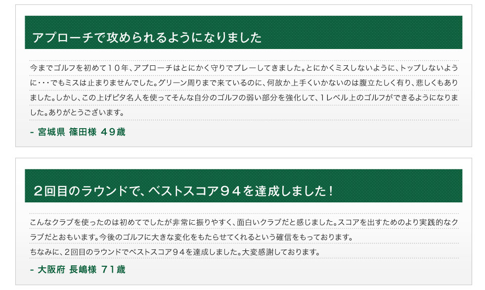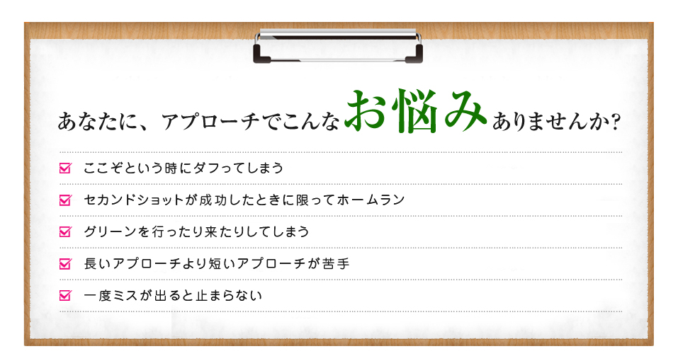 - アプローチでダフリやトップが出て困っている方。90が切れていない方。イップスで悩んでいる方。