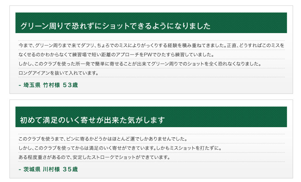 - 勿論、どちらも素晴らしいアプローチ専用クラブです。ただし、特性が異なりますので転がしたいとき、上げたい時でこの2本を使い分けていただくか、あなたのセッティングに合うクラブを入れてみてください。