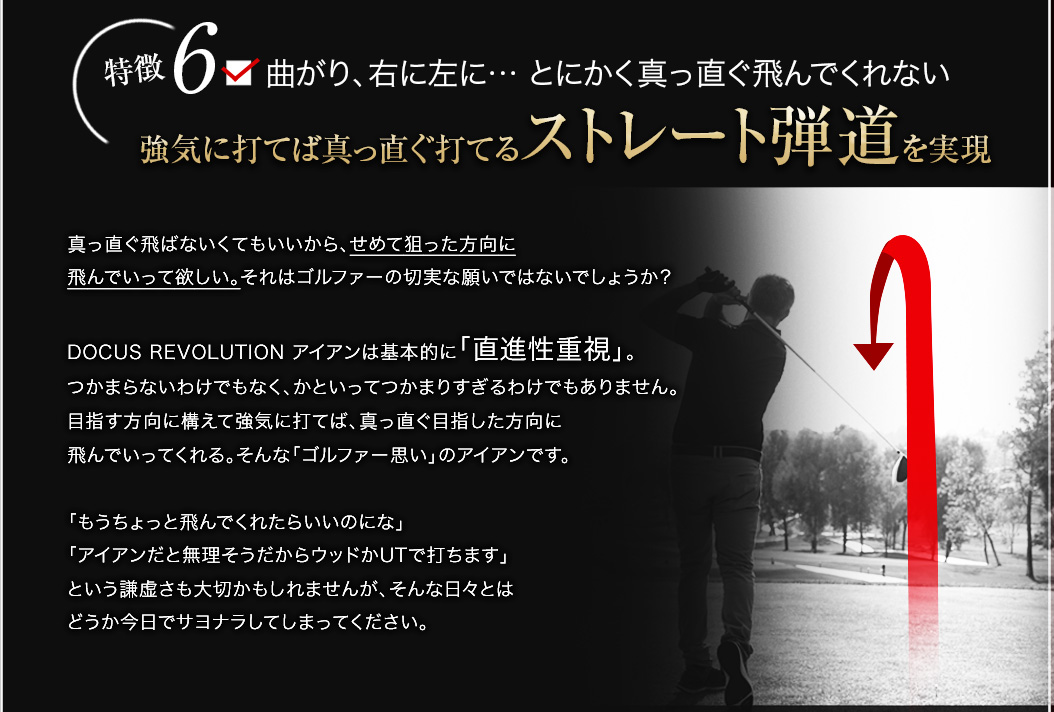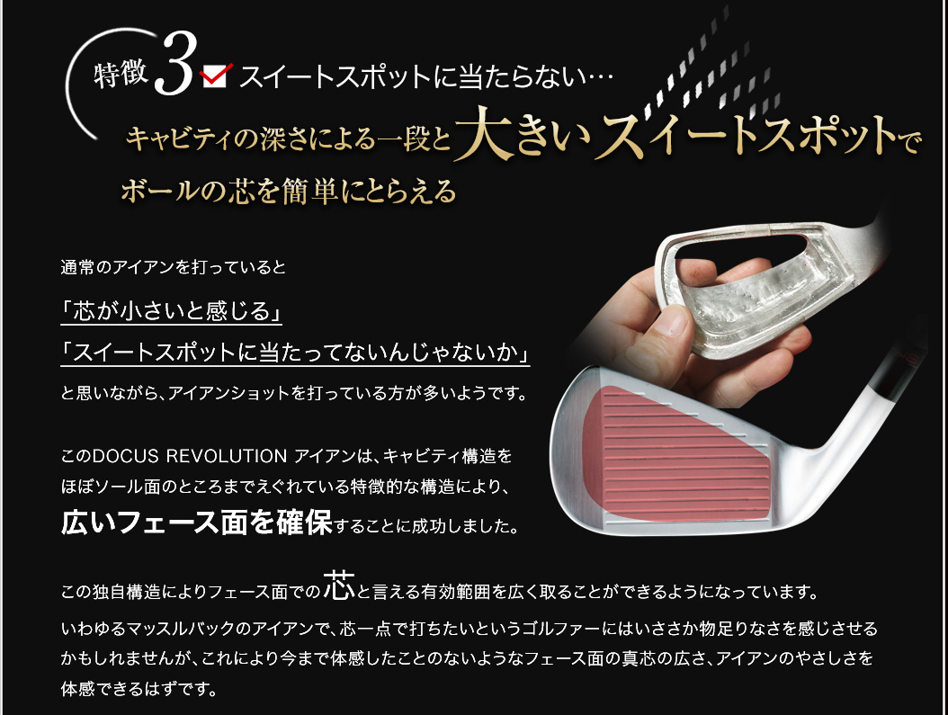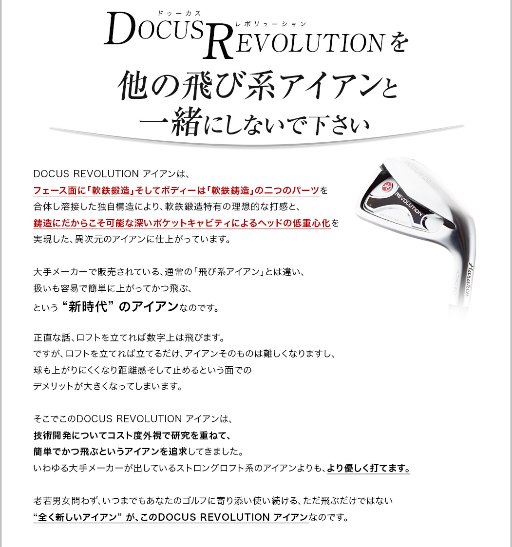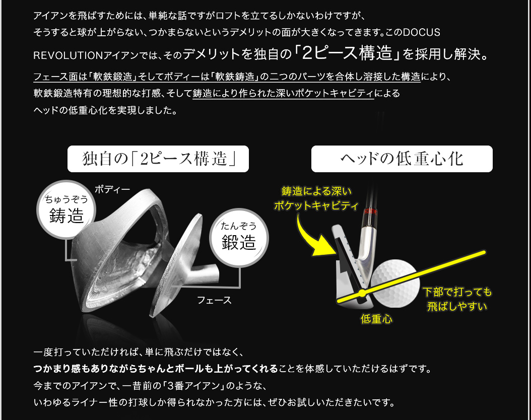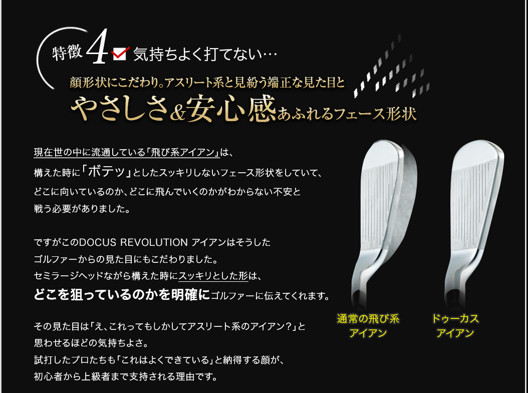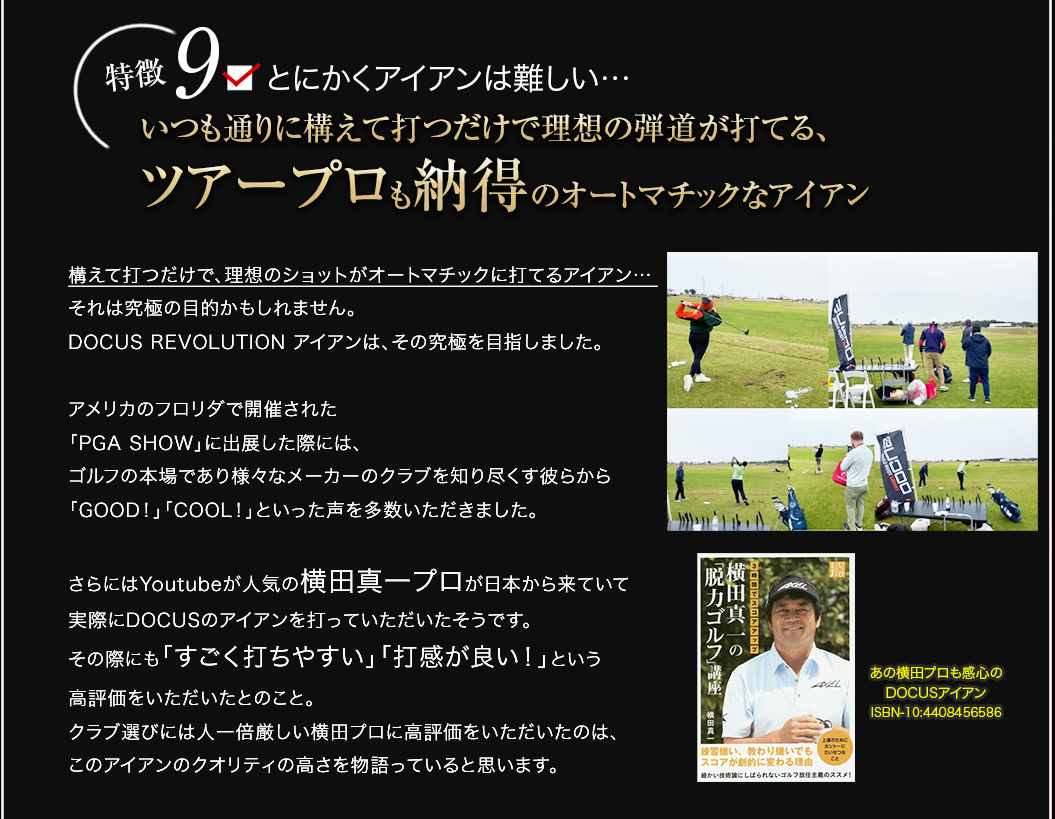 「軟鉄鍛造がいい、というふうにだけ思っていて、自分もずっと軟鉄鍛造のアイアンを背伸びして使っていましたが、鍛造には鍛造のデメリットがあるんですね。イメージだけで決めつけるのはいけないなと思いました。DOCUSさんの考え方というか、信念のようなものを感じさせるアイアンですね。そうした考えにも共感して、使ってみたいと思います。」