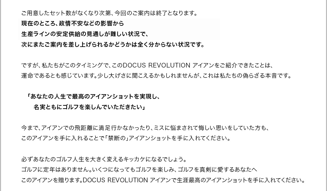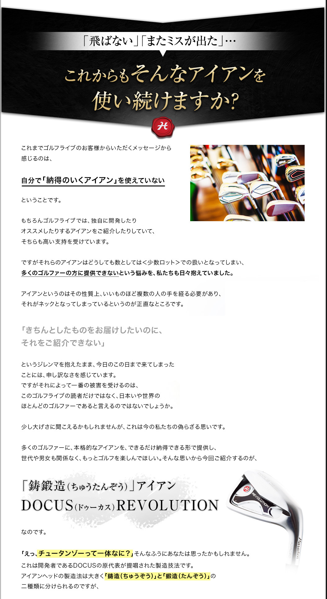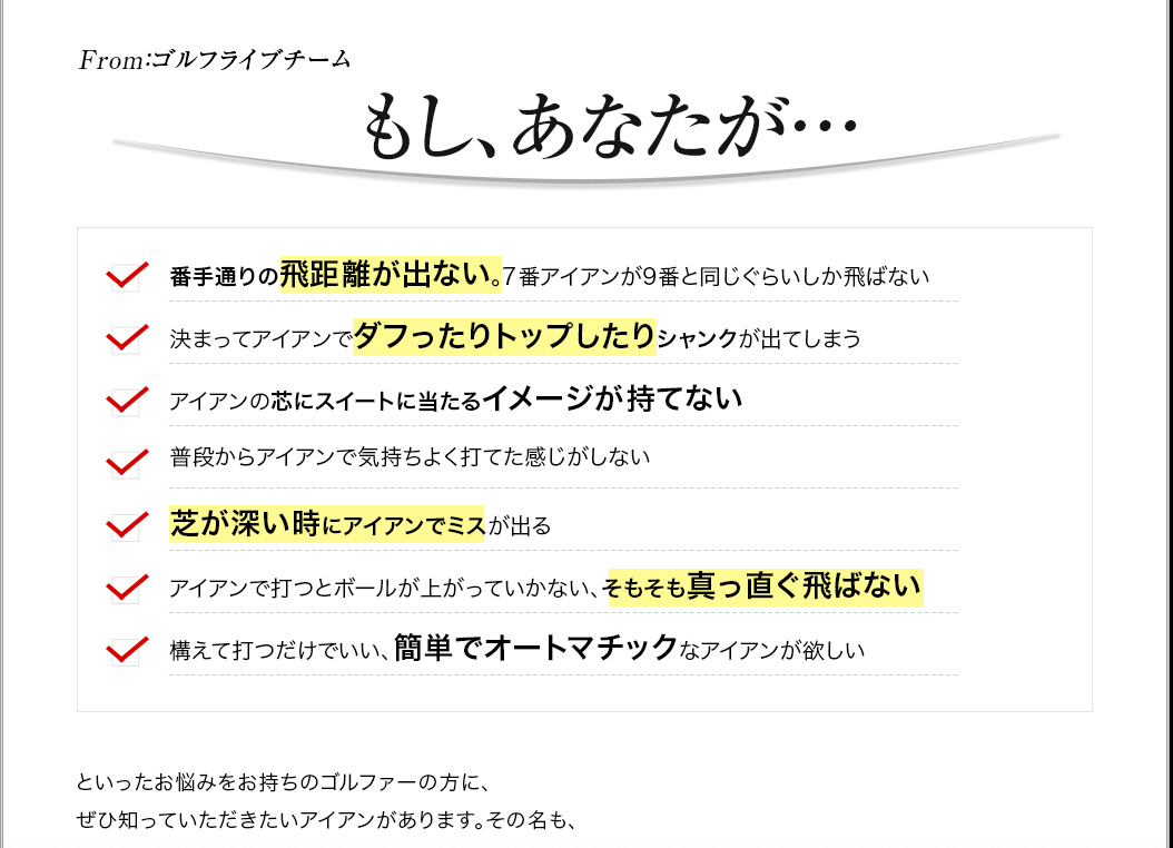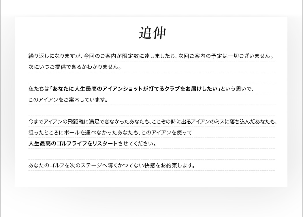 アイアンが以前より飛びました。飛ぶのももちろん嬉しいのですが、アイアンとしてもカッコいいのが有り難いです。一生もののアイアンになりそうな気がしています。早速予約しました。どうもありがとうございます。」