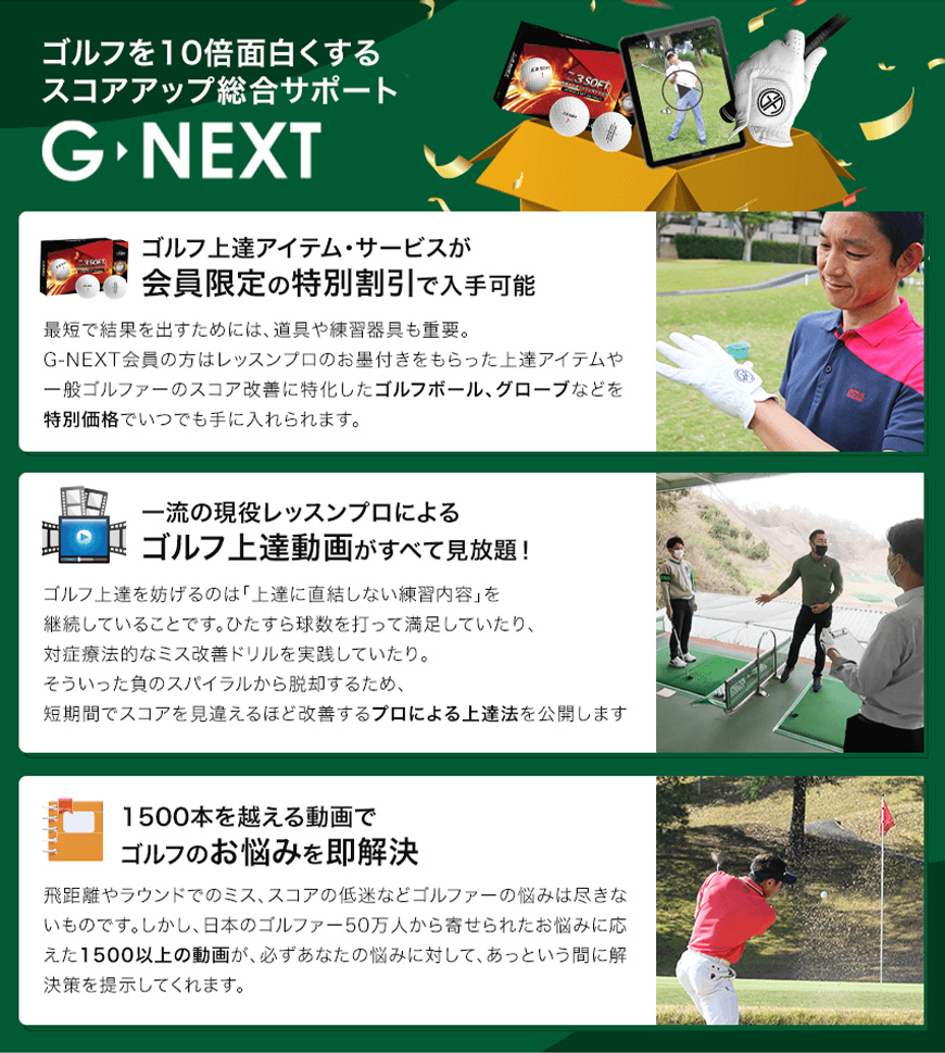 「G-NEXT」とは、ゴルフの上達に関するアイテム・レッスン動画など総合的なサポートを行うゴルフ上達サービスです。