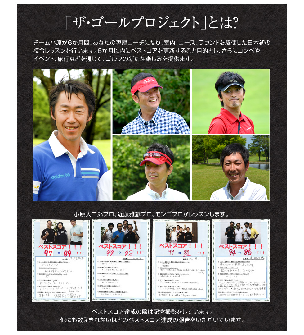 6ヶ月間小原大二郎プロを初め、小原理論を身に付けたレッスンプロがあなたを指導して、目標スコア達成を目指すレッスンプロジェクト。それがザ・ゴールです。