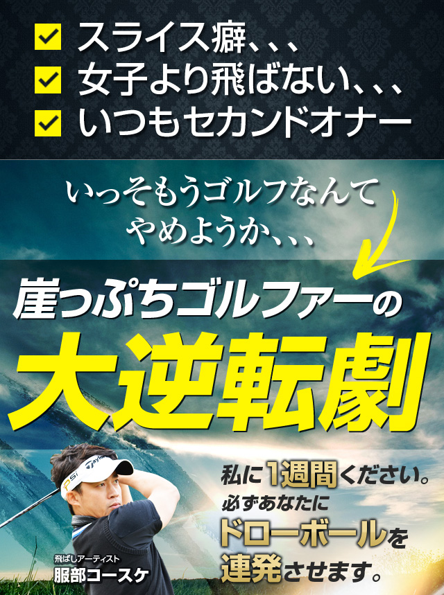 のプログラムは、周りのゴルファーのほとんどが何年かけても手に入れられない強弾道のハイドローボールをたった1ヶ月、早ければ1週間程度で身に付けてしまうという、飛距離やスライスに悩みを抱えているゴルファーに向けたものです。