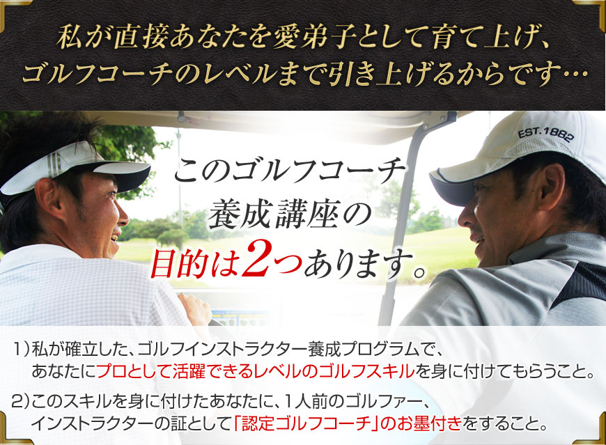 私はゴルフコーチのプロ集団を作りたいとずっと思っていましたし、今も思っています。しかし、いま私たちだけで全国のゴルファーのすべての目標を叶えることは不可能です。人手も足りませんし、時間も足りません。ただ、私たちにはこれまで培ってきたノウハウがあります。上達実績NO.1を獲得した実績があります。なので、この上達ノウハウを継承したゴルフコーチのプロ集団を作って、チームで仕事をすることができるようになれば、、、受けられる生徒さんの数も大幅に増えるでしょう。そうすれば、いいレッスンを世の中に広めながら、生徒さんにも喜んでもらい、あなたも私たちも収益的なメリットを受け取ることができるようになります。この愛弟子の参加者から、そんなプロのゴルフコーチがたくさん生まれること。そして、ゴルフ業界を盛り上げてくれる私のパートナーになってくれることを、楽しみにしています。ぜひ個別相談会でお会いしましょう。 ―小原大二郎
